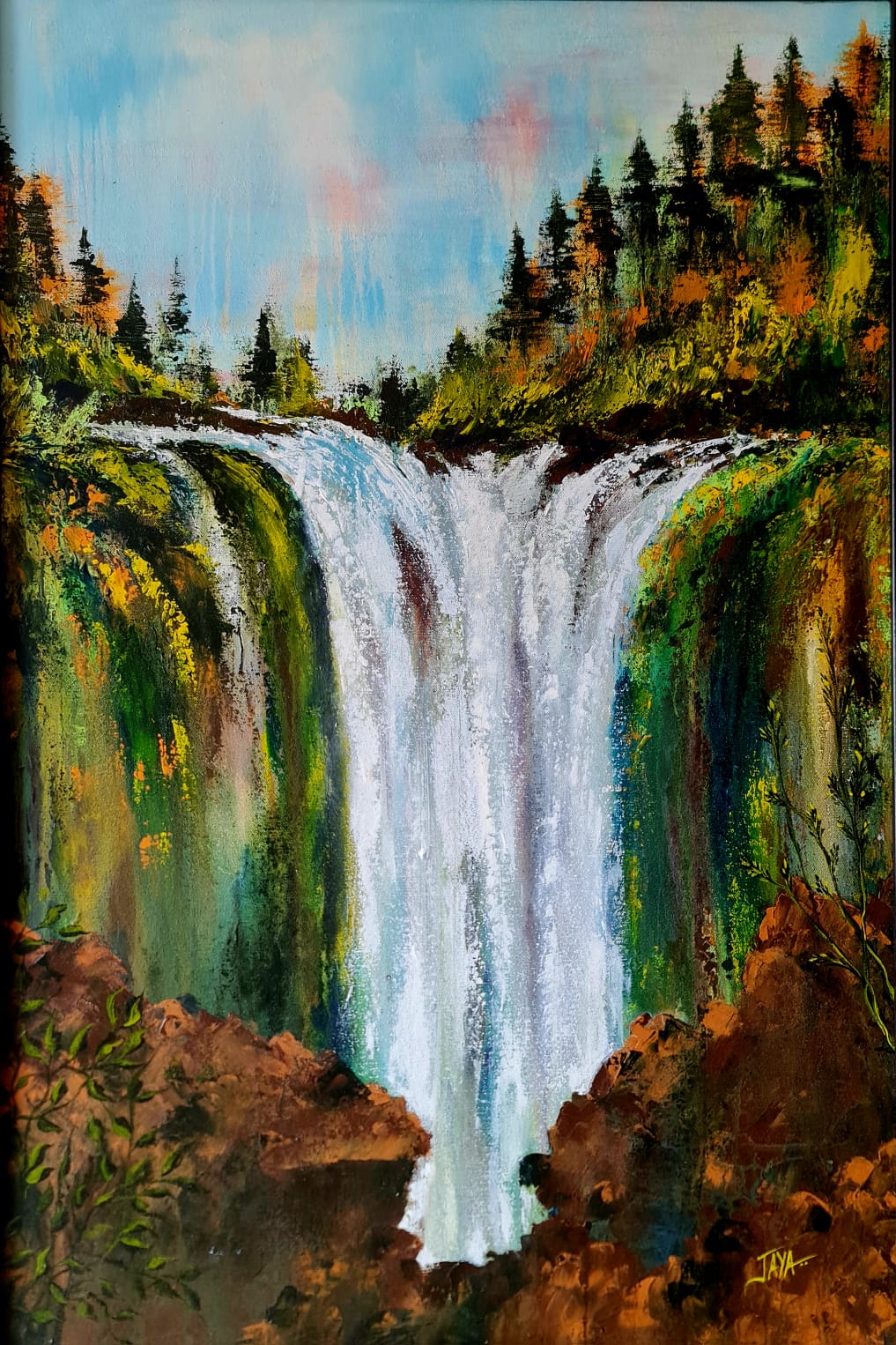 Whispering Cascades is an original acrylic painting by artist Jaya that captures the serene poetry of nature in motion. The cascading waterfall flows gently through a lush landscape, evoking the soothing sound of water whispering to the earth below. With delicate brushstrokes and a harmonious blend of colors, Jaya brings alive the freshness, calm, and quiet strength of nature. This artwork invites viewers to pause, breathe, and feel the peace hidden within the rhythmic flow of life — a timeless reminder of nature’s tranquil beauty.